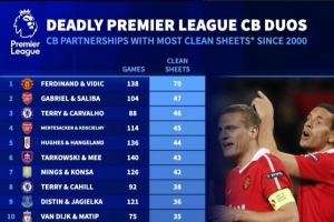2000年以來中衛(wèi)組合英超零封榜(僅統(tǒng)計(jì)兩人聯(lián)袂首發(fā)比賽)