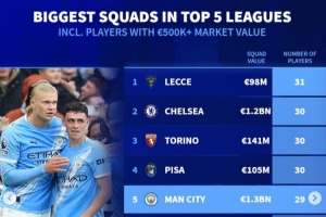 體育資訊1月20日訊 曼城已經(jīng)官宣簽下水晶宮隊(duì)長(zhǎng)格伊,《轉(zhuǎn)會(huì)市場(chǎng)》也統(tǒng)計(jì)了本賽季五大聯(lián)賽球隊(duì)人數(shù)最多情況,萊切居首。