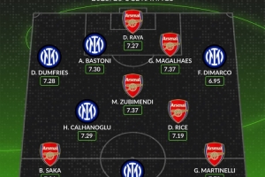 體育資訊1月20日訊 阿森納將在本輪歐國客戰(zhàn)國米,whoscored統(tǒng)計(jì)了雙方的本賽季歐冠評分合體最佳陣,槍手6人、國米5將。