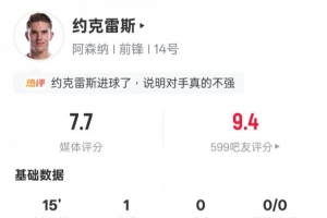 體育資訊1月21日訊 歐冠聯(lián)賽階段第7輪,阿森納客場3-1戰(zhàn)勝國際米蘭。約克雷斯替補(bǔ)出戰(zhàn),2次射門1次射正打進(jìn)1粒進(jìn)球,評分7.7。
