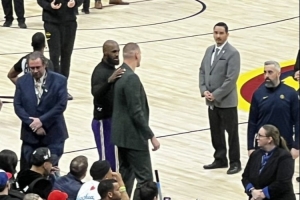 詹姆斯在比賽進(jìn)行期間主動(dòng)前往掘金替補(bǔ)席擁抱了約基奇。