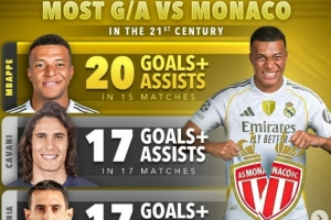據(jù)統(tǒng)計(jì),姆巴佩在面對(duì)老東家摩納哥的15場(chǎng)比賽中已經(jīng)直接參與20球,在21世紀(jì)對(duì)陣摩納哥參與進(jìn)球(進(jìn)球+助攻)榜上位居第一,具體榜單如下:
