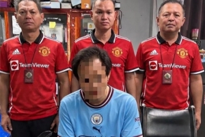 體育資訊1月22日訊 《太陽報》報道,泰國警察逮捕了一名曼城球迷,他們還穿著曼聯(lián)球衣拍了他的逮捕照。