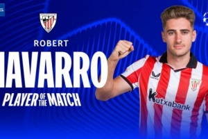此役羅貝托·納瓦羅為畢爾巴鄂競(jìng)技踢滿全場(chǎng),打進(jìn)1球,助攻2次,他當(dāng)選歐冠官方本場(chǎng)比賽最佳球員。