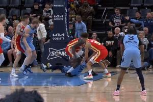 莫蘭特落地后抓住球,蓋耶過來搶,還跨了莫蘭特!