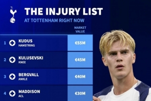 體育資訊1月23日訊 德國(guó)轉(zhuǎn)會(huì)市場(chǎng)列出了熱刺傷員的身價(jià)排名,庫(kù)杜斯5500萬(wàn)歐居首,庫(kù)盧塞夫斯基4500萬(wàn)歐次席。