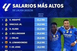 以下為2025-26賽季西甲球員年薪排行top15: