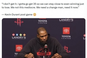 賽后,美媒Hoop Quotes曬出了杜蘭特的賽后采訪,他說(shuō)道:“我不明白。我必須拿到35分才能勉強(qiáng)保持比賽的懸念,結(jié)果還是輸球。我們不應(yīng)該這么平庸。我們需要改變,現(xiàn)在就需要。哦不,我得去做我的工作了。無(wú)論輸贏,我還是能拿到數(shù)百萬(wàn)的報(bào)酬?!?/p>