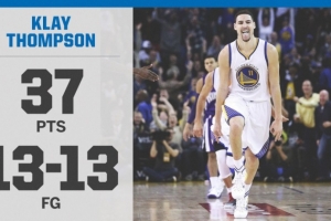 克萊在上半場不顯山露水,9投3中得到13分,但在第三節(jié)突然暴走,他單節(jié)打滿12分鐘,13投13中,其中三分9中9,罰球2中2,單節(jié)得到37分,創(chuàng)NBA歷史個人單節(jié)得分紀(jì)錄!