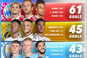 體育資訊1月24日訊 數(shù)據(jù)網(wǎng)站Score90盤點了本賽季五大聯(lián)賽球隊進攻三叉戟在各項賽事進球榜,具體如下: