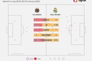 據(jù)Opta統(tǒng)計(jì),此役上半場比利亞雷亞爾射門4次、射正0次,據(jù)Opta統(tǒng)計(jì),皇馬是2026年五大聯(lián)賽唯一上半場還沒有被對(duì)手射正過的球隊(duì)。