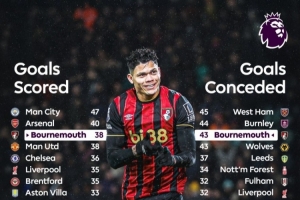 體育資訊1月25日訊 英超第23輪比賽,伯恩茅斯主場3-2擊敗利物浦,據(jù)英超官方統(tǒng)計,伯恩茅斯本賽季英超進球、丟球皆排在第三名。