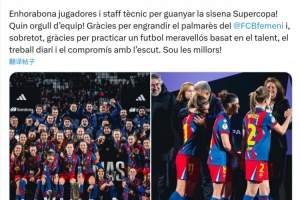 巴薩俱樂部主席拉波爾塔社媒曬出女足姑娘們與獎杯的合照,并寫道:“恭喜球員們和教練團隊贏得第六座西班牙超級杯,多么令人驕傲的一支球隊!”