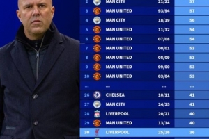 在英超歷史上,本賽季的利物浦位居最糟糕的衛(wèi)冕冠軍之列,紅軍在23輪之后的積分僅僅高于1995-96賽季的布萊克本(35分)、2015-16賽季的切爾西(28分)、1992-93賽季的利茲聯(lián)(28分)以及2016-17賽季的萊斯特城(21分)。