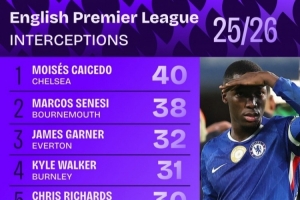 體育資訊1月27日訊 Squawka統(tǒng)計(jì)了本賽季球員在英超的攔截次數(shù),并列出榜單,凱塞多40次居首。
