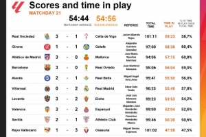 體育資訊1月27日訊 數(shù)據(jù)顯示,西甲第21輪沒有任何一場比賽的凈時間超過了60分鐘,平均凈時間為54分44秒。