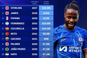 體育資訊1月29日訊 德轉(zhuǎn)統(tǒng)計(jì)切爾西隊(duì)內(nèi)的年薪排行,剛剛官宣離隊(duì)的斯特林此前年薪1950萬歐排名隊(duì)內(nèi)第一,里斯·詹姆斯、福法納排名前三。