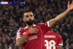 比賽第50分鐘,利物浦任意球索博斯洛伊一踩,薩拉赫左腳轟出世界波,打進(jìn)非洲杯結(jié)束歸隊(duì)后首球,拍胸口利物浦隊(duì)徽慶祝!場(chǎng)上比分利物浦3-0卡拉巴赫。