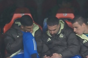 皇馬替補席上,卡瓦哈爾、塞巴略斯、盧寧正在查看實時積分榜,目前皇馬排名第8位,想要直接晉級16強,需寄希望于巴黎不進球。