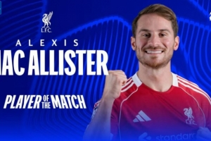 本場(chǎng)比賽麥卡利斯特梅開二度,賽后當(dāng)選歐冠官方評(píng)選出的本場(chǎng)最佳球員。