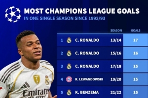 體育資訊1月29日訊 德國轉(zhuǎn)會市場統(tǒng)計了192-1993賽季歐冠改制以來球員單賽季進(jìn)球數(shù)量,并列出榜單,13-14賽季C羅17球居首,本賽季姆巴佩13球并列第7。