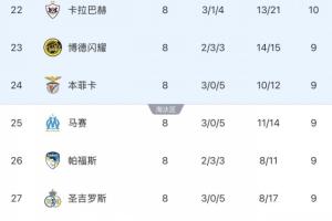 體育資訊01月29日訊 歐冠小組賽第7輪結(jié)束后,馬賽9分、0凈勝球排名第19位,本菲卡6分、-4凈勝球排名第29位。