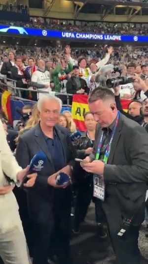體育資訊01月29日訊 本菲卡4-2皇馬賽后,穆里尼奧接受場邊采訪時,一旁的皇馬球迷高唱穆里尼奧之歌。