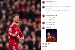 麥卡利斯特也在賽后通過社媒曬出自己的慶祝照,并配文:“ 晉級(jí)歐冠16強(qiáng)戰(zhàn)??@利物浦”。