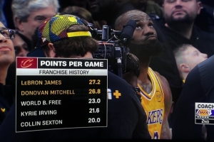 騎士主場迎戰(zhàn)湖人,轉播方曬出騎士隊史場均得分前五: