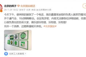 博主北京的暉子在社媒寫道:“今天下午,很突然的接到了一個電話,周總邀請球迷組織負責人就受罰情況到工體開個通氣會,18點剛剛散會。會議有涉密,內(nèi)容無法跟各位詳細說明,但是我可以很負責任的告訴大家,俱樂部沒有錯,沒有錯,沒有錯!