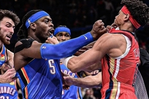雷霆和鵜鶘的比賽最后時(shí)刻,場上卻突然發(fā)生沖突:站在戰(zhàn)場中央的兩位,一個是全聯(lián)盟頂級惡人多爾特,而另一位,卻是一個比他足足輕了30斤的新秀,杰里米亞-費(fèi)爾斯。