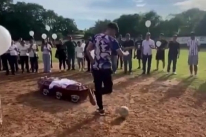他的棺槨被放置在點(diǎn)球點(diǎn),一位隊(duì)友將球踢向棺槨,球彈入網(wǎng)窩。隨后眾人鼓掌致意,并放飛了白色氣球。