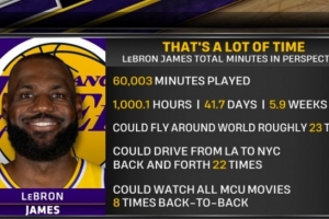 詹姆斯生涯至今出戰(zhàn)60003分鐘,可以換算為1000.1小時(shí)、41.7天、5.9周,能夠坐飛機(jī)環(huán)繞地球23圈,能夠開車從洛杉磯到紐約往返22次,可以連續(xù)8次觀看《復(fù)仇者聯(lián)盟》系列電影