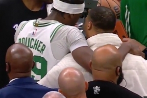 GIF-布歇壓哨扔進(jìn)三分,威少不滿差點(diǎn)沖突,隨后雙方解釋互相友好退場(chǎng)