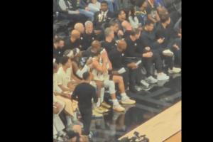 灣區(qū)媒體95.7 The Game曬出庫里在場邊的畫面,當(dāng)時庫里沮喪地拍了拍大腿,隨后一瘸一拐走回更衣室。