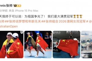 體育資訊1月31日訊 奪得澳網女雙冠軍后,張帥更新社媒,表示自己“為祖國爭光了”。