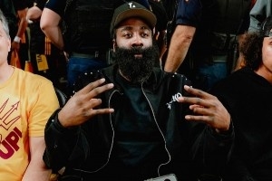 比賽間隙,哈登還和兩位橄欖球隊(duì)校友喬丁·泰森(下圖中)、卡梅倫·斯卡特博(下圖左)互動(dòng)。