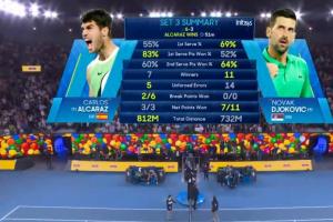 第9局比賽德約發(fā)球局,阿爾卡拉斯連得3分40-0拿到3個(gè)盤點(diǎn)!但是德約科維奇連追3分全部救回!40-40!緊接著阿爾卡拉斯再度獲得盤點(diǎn),德約再次救回!隨后德約2次獲得局點(diǎn)但也沒把握住。阿爾卡拉斯第5次獲得盤點(diǎn),終于兌現(xiàn)成功!阿爾卡拉斯6-3德約,大比分2-1領(lǐng)先!