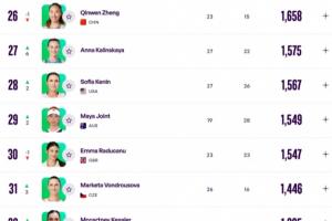WTA排名更新,薩巴倫卡、斯瓦泰克仍居前2,萊巴金娜上升2位至第3,高芙下跌2位至第5,鄭欽文再跌1位至第26,王欣瑜上升13位至第33。