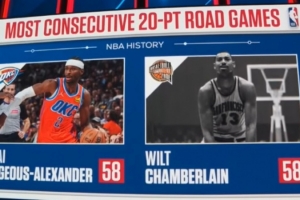 此外,值得注意的是,亞歷山大目前連續(xù)58場客場得分20+,已經追平了張伯倫保持的NBA歷史紀錄!