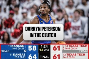 比賽最后時(shí)刻,堪薩斯大學(xué)打出一波17-4的攻擊波完成大逆轉(zhuǎn),彼得森最后投中了兩記高難度三分,包括準(zhǔn)絕殺的三分。
