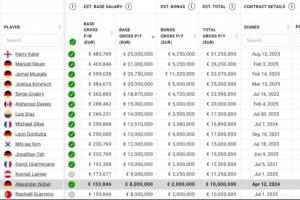 目前拜仁球員的薪資水平在全球位列第一梯隊,據(jù)球員薪資數(shù)據(jù)網(wǎng)站capology的信息,目前已經(jīng)有6名拜仁的球員的年薪+獎金超過了2000萬歐,其中凱恩與穆西亞拉超過3000萬歐。于帕續(xù)約后,拜仁隊內將有7人年薪+獎金超過2000萬歐。