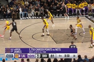 詹姆斯對(duì)陣籃網(wǎng)共得到1750分史上最多