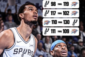 目前,雷霆40勝11負(fù)西部第一,馬刺33勝16負(fù)西部第二。
