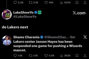 Shams也是有求必應(yīng),在五分鐘后報道了湖人中鋒海斯被禁賽一場的消息??。