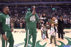 體育資訊2月7日訊 在今日雄鹿對陣步行者的賽前。波蒂斯攜手字母哥哥向字母哥致敬,并祝他連續(xù)10次進(jìn)入全明星陣容。