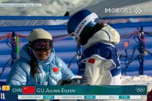 谷愛(ài)凌首跳出現(xiàn)失誤意外摔倒,她的媽媽在場(chǎng)邊擁抱安慰女兒