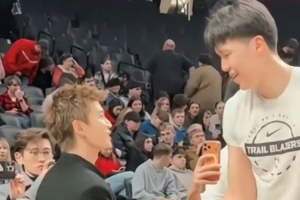 體育資訊2月8日訊 今日上午開拓者主場(chǎng)背靠背再戰(zhàn)灰熊,賽前演員任嘉倫來到場(chǎng)邊給楊瀚森加油,與其握手聊天。