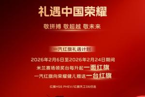一汽紅旗在宣傳海報中寫道:米蘭賽場領(lǐng)獎臺每升起一面紅旗,一汽紅旗向榮耀健兒贈送一臺紅旗。