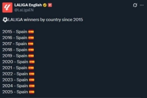 西甲官推隨后轉(zhuǎn)發(fā)了這條動(dòng)態(tài),并表示:“西班牙包攬了2015年至今的所有西甲冠軍。”